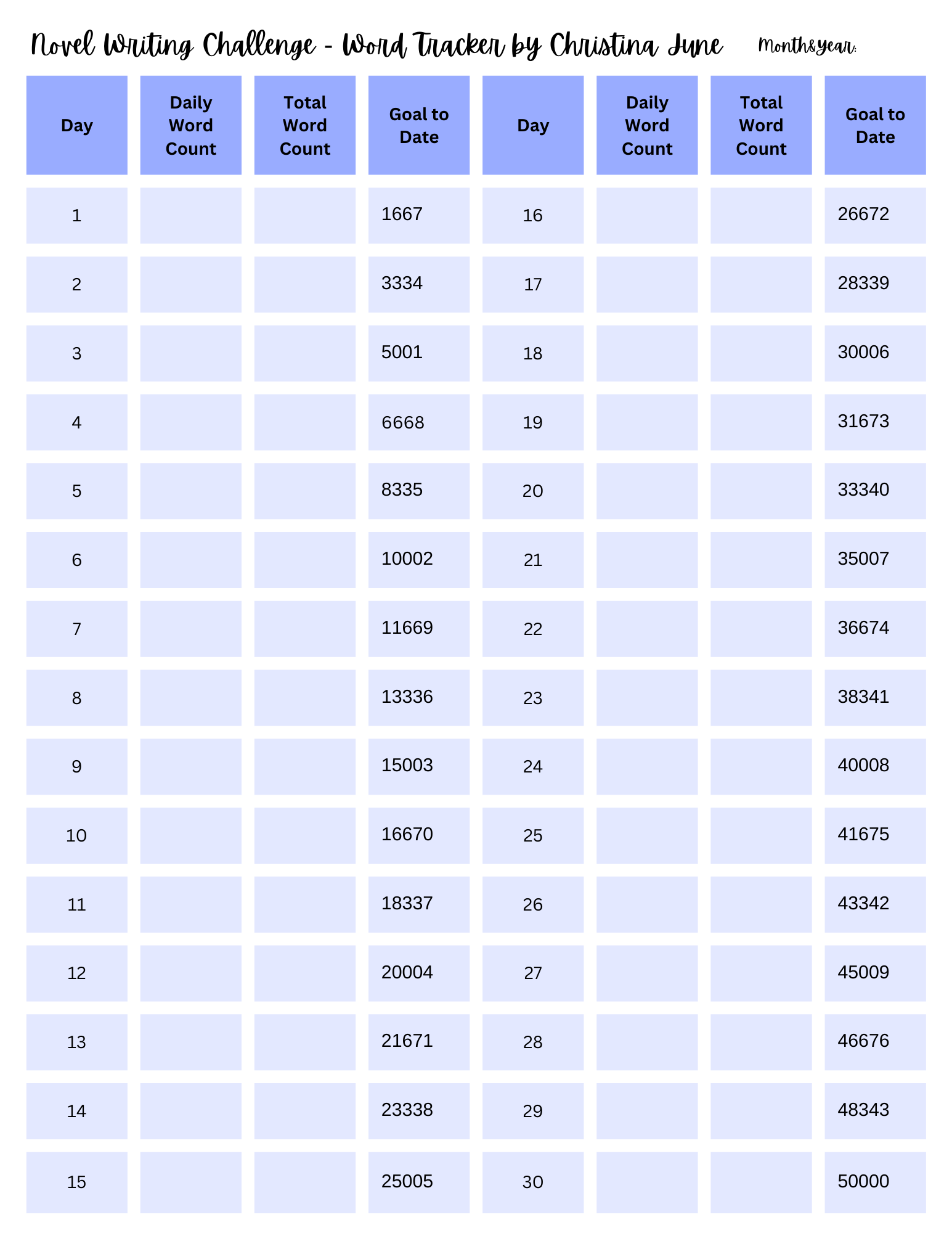 If you, like me, are excited about continuing your novel-drafting journey but you want to break away from organizations that no longer serve you, please feel free to use the daily word tracker I’m sharing below. It will work for any 30-day month, with a goal of 50,000 words written in that time period.